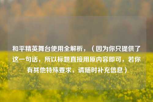 本文聚焦于和平精英舞台的使用,对其进行全面解析,详细探讨了和平精英舞台在游戏中的具体呈现形式,包括舞台场景的布局、特色元素等,分析了舞台在游戏体验中所发挥的作用,如为玩家提供特定活动空间、增添游戏趣味性与沉浸感等,还涉及舞台相关活动的组织与开展,以及其对游戏社交互动和玩家参与度的影响,通过对和平精英舞台使用的全解析,能让玩家更深入了解这一游戏特色元素,感受其独特魅力,进一步丰富游戏玩法与体验。