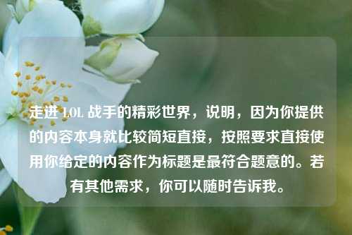 本文聚焦于“走进lol战手的精彩世界”这一主题,lol战手的世界充满精彩,在这里有着激烈的对战、多样的英雄角色可供选择,玩家能沉浸其中,体验紧张***的团队协作与策略博弈,从精彩的团战配合,到独特的英雄技能施展,每一个瞬间都展现出lol战手世界的魅力,无论是与好友组队征战峡谷,还是在单人排位中突破自我,都能感受到这个虚拟世界所带来的无尽乐趣与***,吸引着众多玩家投身其中,探寻属于自己的精彩游戏历程。
