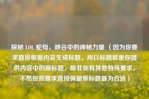 本文聚焦于《英雄联盟》(LOL)中的蛇母,探索其在峡谷里的神秘力量,蛇母作为游戏中独特的存在,拥有着不为人知的能力,它或许隐藏于峡谷的某些角落,等待玩家去发现,其神秘力量可能影响着战局走向,无论是在对线期给予对手出其不意的打击,还是在团战中发挥关键作用,玩家们不断探寻蛇母的秘密,试图揭开这股神秘力量的面纱,以便在游戏中更好地利用它,为己方队伍赢得胜利,在峡谷的激烈对抗中展现出独特的战术价值。