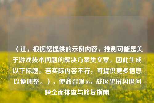 《使命召唤:现代战争》(COD16)的“大逃杀”模式(Warzone)凭借其紧张***的玩法吸引了大量玩家,但许多用户反馈在游戏过程中频繁遭遇黑屏闪退问题,严重影响体验,本文将分析可能的原因,并提供一系列已验证的解决方案,助你快速回归战场!